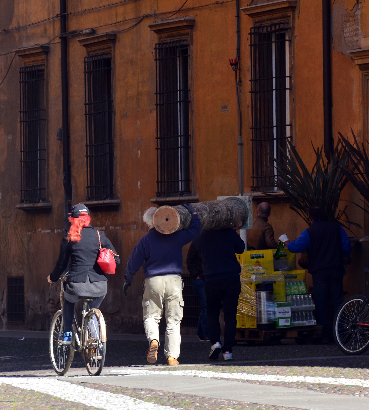 Three chaps hang on to the rear of the cart in the name of health and safety and rudimentary braking and there is much hoing and lowing as the parade makes its way through town. The cart is laden with fireworks and with every other Italian it passes sparking up a fag it is a miracle it doesn't go off before it reaches its destination outside the doors of the Doumo and Campenile.